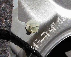 Man erkennt den kleinen weißen Plastikhalter sowie unten zwei Haltezungen am Dreieck: Beim Wiedereinbau darauf achten, dass sie sauber in die vorgesehenen Schlitze passen !