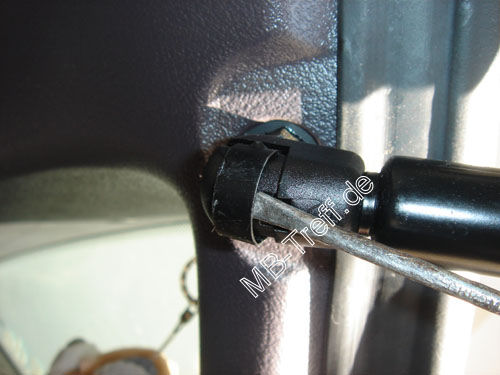 Sicherung anheben und Gasdruckfeder an der Rückwandtür abbauen. Ebenso an der C-Säule. Hierbei die Sicherung nicht komplett abhebeln, da sonst die Vorspannung verloren gehen könnte. Zudem würde dann eine erhöhte Verletzungsgefahr bestehen, da das Metallteil einem gerne entgegen springt!